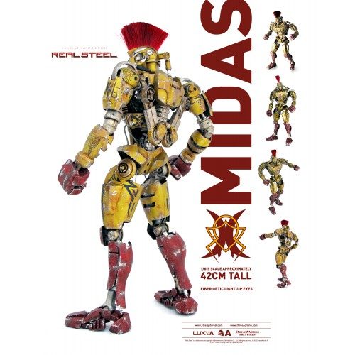 The Midas REAL STEEL Sixth Scale figure. Crafted with exceptional attention to detail, it features fiber optic light-up eyes and extensive articulation. Designed by renowned artist, Ashley Wood, the Midas - REAL STEEL Sixth Scale figure measures approximately 16.5 inches tall and makes an impressive addition to any collection.